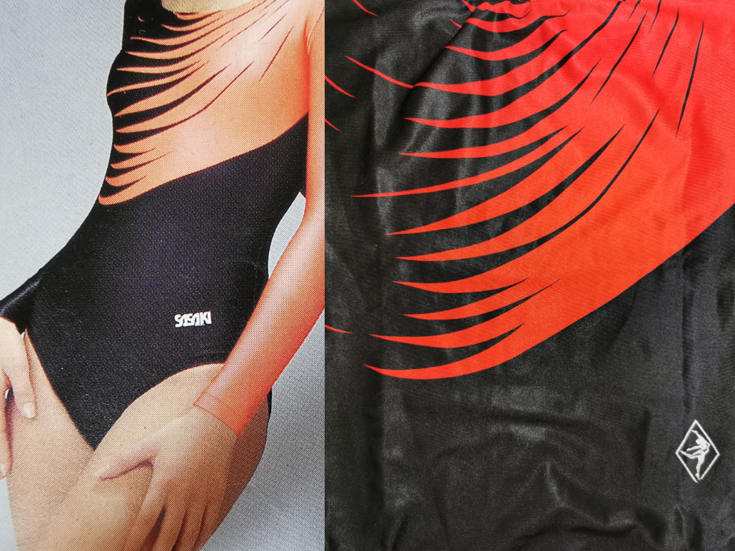 赤と黒の二色使いというシンプルなこのレオタードはササキスポーツ1992年のカタログモデルで、