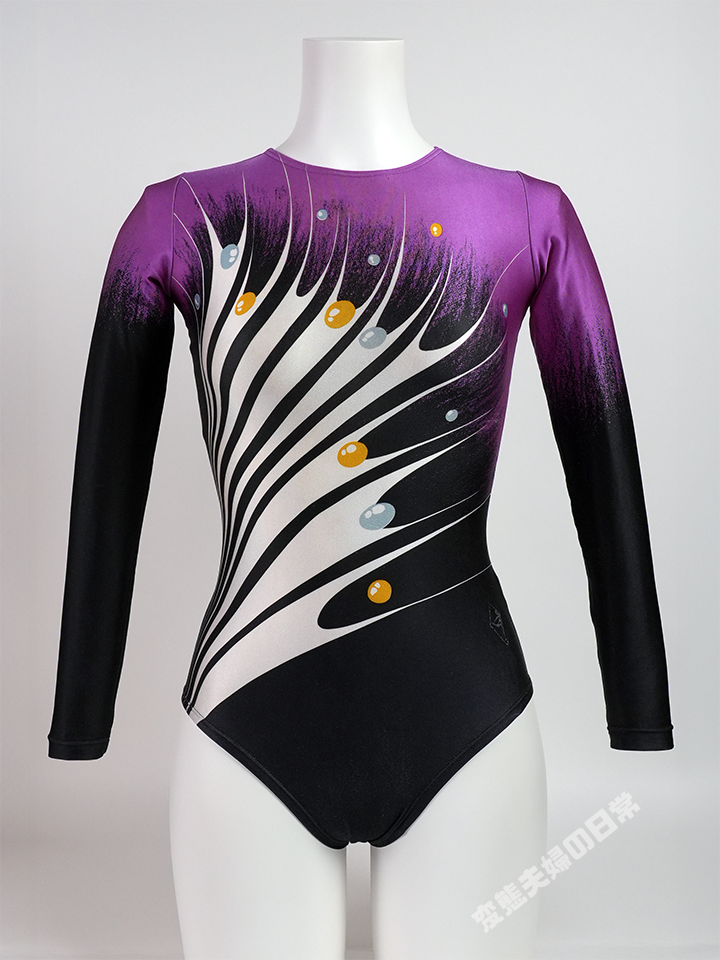 同じ絵柄のモデルのカラー違いを紹介する。簡単に紹介すると、このレオタードは“深海”のタイトルが付けられていて、1992年のカタログにも掲載されていたモデルである。 当時主流のオールプリントモデルで、ファスナーバックの形状が特徴である。 この頃のオールプリントモデルと言えば生地の薄さや光沢が素晴らしく、 人によっては最もレオタードらしい時代だったと言うだろう。 特に90年代前半までの新体操は、躍動感あふれるアグレッシブな演技が多く見られ、 そういった演技にササキスポーツのプリントモデルは、とてもマッチしていた。 この時代のオールプリントモデルに共通して言えることだが、この頃のプリント生地は本当に着心地が良い。 肌にピタピタっと張付いてくる感じはこの時代特有のものだ。 足を入れ、腕を通しただけで興奮が込み上がってきて、 背中のファスナーを閉じた時に真の気持ち良さに包まれる。 肌に張り付く締め付けを感じながら生地を撫でれば、非常にスベスベとした感触に身体がゾワっと反応してしまう。 同時に、新体操のために生まれたこのウェアがこんなにもフェチである事に更に興奮するのだ。 このモデルのカラーバリエーションは今回紹介したパープルとアクアブルー(正式なカラー名は確認中)の他、 レッドの三色を展開していた。 →2023年10月にレッド入手!念願のコンプリート達成しました!! |