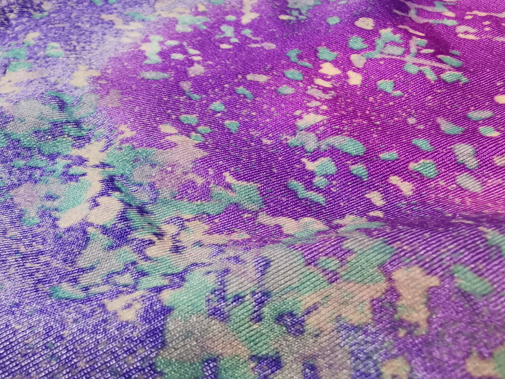 プリント生地の拡大写真 マーメイドと名付けられたプリント生地。 パステルの濃淡に透明感のある箔を乗せ、マーメイドをイメージしている。 その柄はとても複雑で、凝ったプリント生地だ。 |