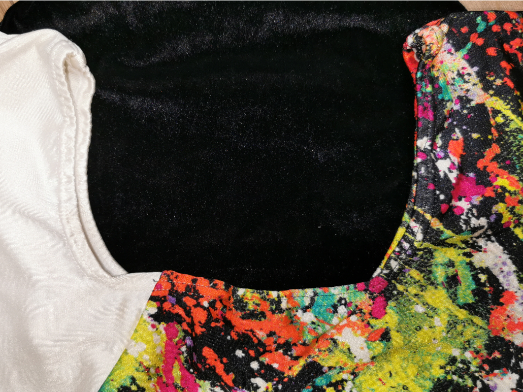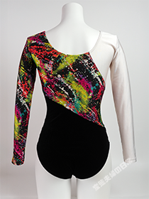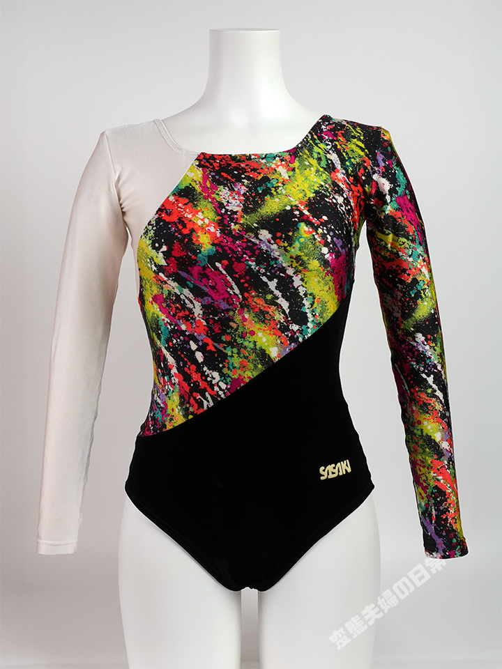 まるで絵具を散りばめたような大胆な絵柄をしたこのレオタードは、ササキスポーツ1996年のモデルである。 観客の注目を集めるような大胆な柄のプリント生地とベロアの切替えは、この頃に多く見られたデザインだ。 そして異素材をパズルのように組み合わせた感じも、90年代らしいものだ。 一見ミスマッチにも見える切替えのラインは、メーカー曰く「着る人をシャープに見せる」との事らしい。 このプリント生地も薄くてツルツルしており、肌触りも素晴らしく良い。 一方でプリント生地にありがちな強い光沢は抑えられ、意外な印象も受ける。 このレオタードもオークションでまとめ買いした中にあった一着で、こうした出会いで無ければ手元に置いてなかっただろう。 ただしベロア生地に痛みが発生(ベロアの起毛が薄くなっていた)していたのは残念な限り。 傷んだベロアを見るのはこれが初めての事で、これには正直驚いた。 |