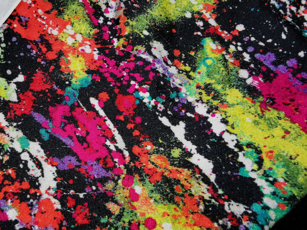 プリント生地の拡大写真 グラフィック名は「プリミティブワールド」 絵具を無造作に散りばめたような大胆な柄だ。 光沢はそこまで強い感じはしない。 |