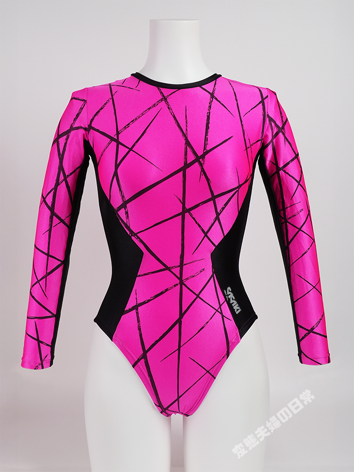 ササキスポーツ1994年のカタログから#7204Gを紹介する。先に紹介した通り、このレオタードは器械体操選手向けモデル「ジムナスト型」で、その最初期モデルである。 「バンブー」という名のこのプリント生地は、色のある下地に模様の部分をプリントしたという、他にあまり見ないタイプのプリント生地だ。 このプリント生地は他にも幾つかのモデルで採用され、1990年代のササキスポーツを代表するプリント柄の一つと言えよう。 カラーはこのパッションピンクと前回紹介したレモンイエロー、そしてホワイトの三色が用意された他、特注と思われるカラーも存在する。 さて、前頁のものは生地に伸びや劣化があり、あまり良い状態とは言えなかった。 そこでよりコンディションが良いものを探していたところ、この個体に出会った。 こちらはロゴに経年劣化があるものの、生地が伸びた感じは全く無く、中々良いコンディションではないだろうか。 特に背面、首で留めるスナップのところの穴の大きさを見ると、こちらのMサイズは穴が大分小さい。 つまり、こちらのMサイズの方は生地が伸びていない状態と言えそうだ。 生地触感は非常にツルツルでサラサラとしており、これが本来の質感なのだ。それだけでもこの個体を入手した意義があると思う。 ところで、このパッションピンクという蛍光カラーは写真で見るよりも鮮やかというか派手で、これを競技(人前)で着るのはなかなか勇気が必要な気がする。 どちらかと言えば、エネルギッシュで可愛らしいジュニア選手の方が似合うかもしれない。 |