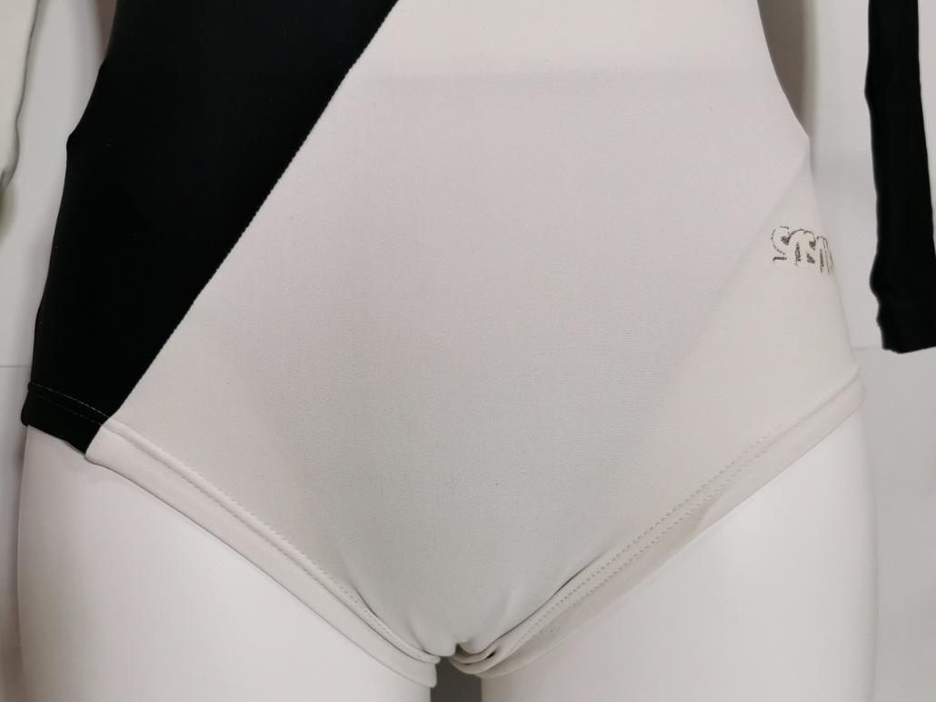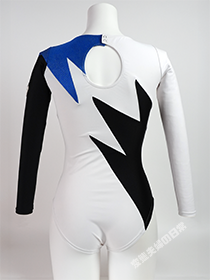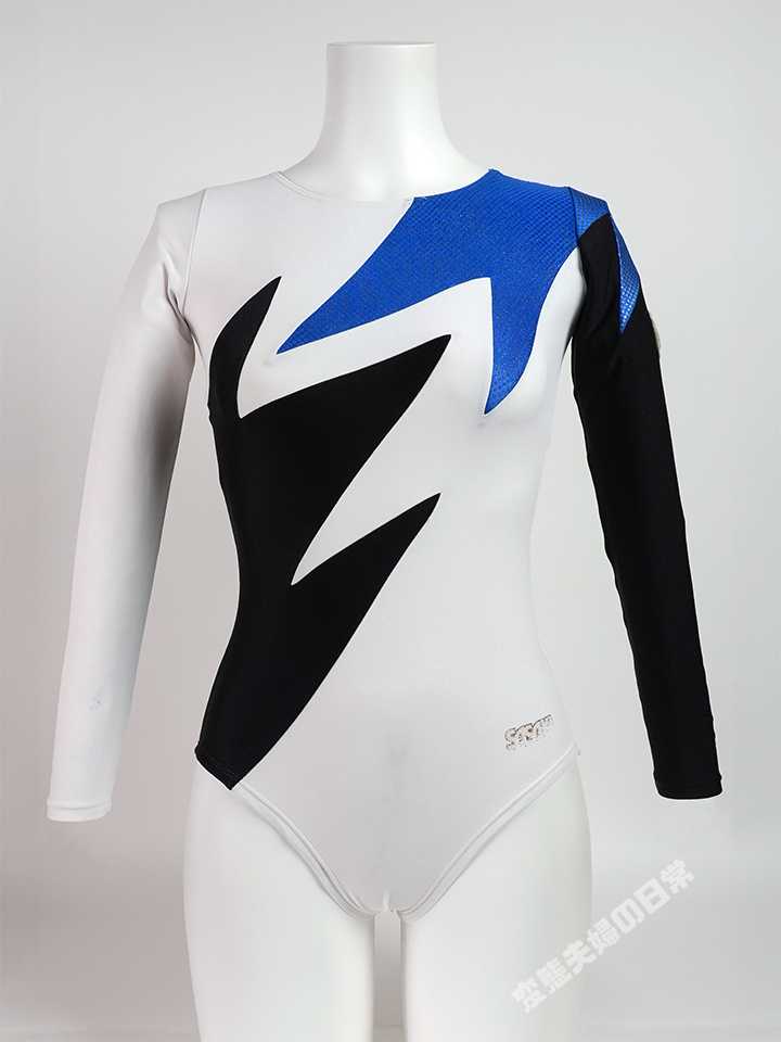 白を基調に青と黒のダイナミックな切替えが特徴のこのレオタードは、1997年に登場したモデルだ。 白いレオタードは目に飛び込んできた時のインパクトが強く、着用する選手も多い定番のカラーだ。 しかし一方で「透け」という大きな問題があるのも事実で、それを解決するためにササキスポーツが採用したのが「ボディシェルα」という素材である。 ボディシェルαは鮮やかさを保ちながら身に着けても透けない「安心して着用できる白」として、1996年に登場した。 その質感は非常にマット(艶消し)で、それによって上品な雰囲気を出していると思う。 これに対して肩に使われる箔素材のキラキラ感がクールで力強い感じを演出する。 しかし残念ながら箔が劣化で落ちてしまった上、洗濯の時に白色部分に接触して色移りも発生してしまった。 箔加工の取り扱いの難しさを実感した、そんな一着でもある。 |