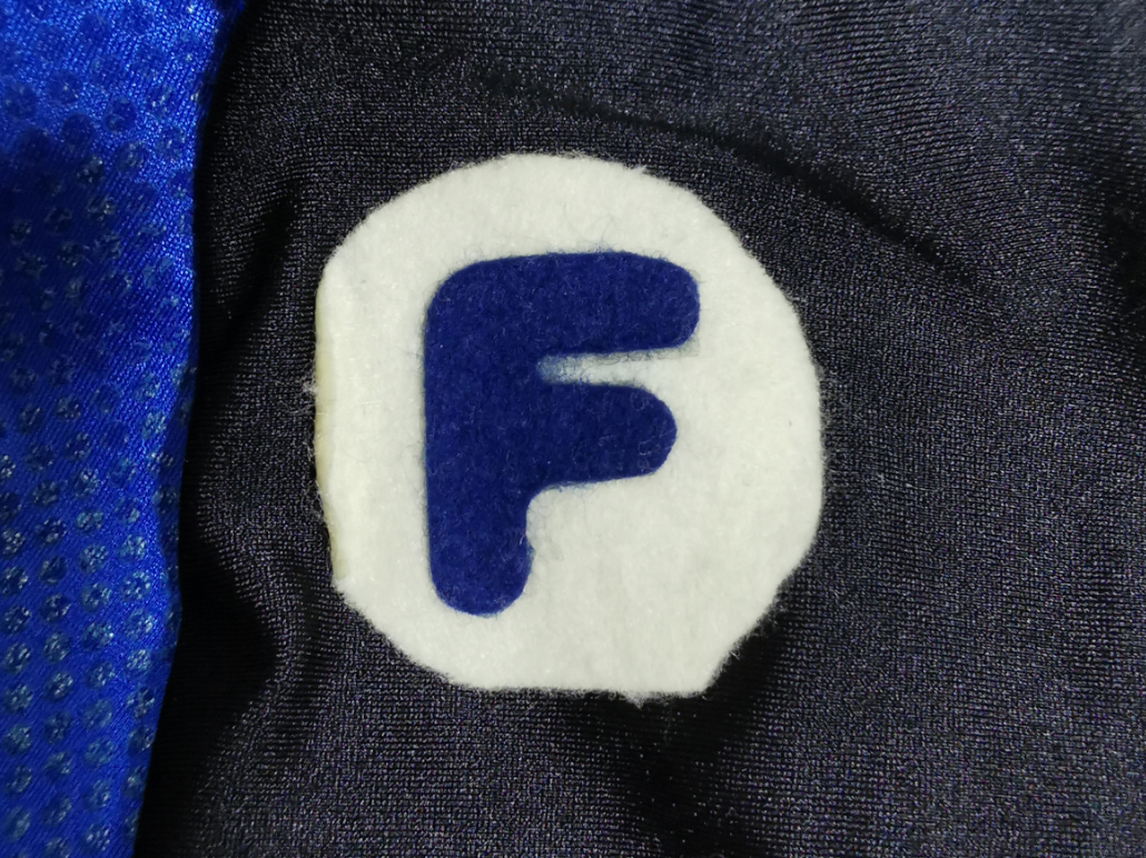 腕に付いたマーク フェルト生地で出来たマーク Fの字は角に丸みがあって可愛らしい。 どこの団体だろうか。知っていても言わないのが大人のお約束だ。 |