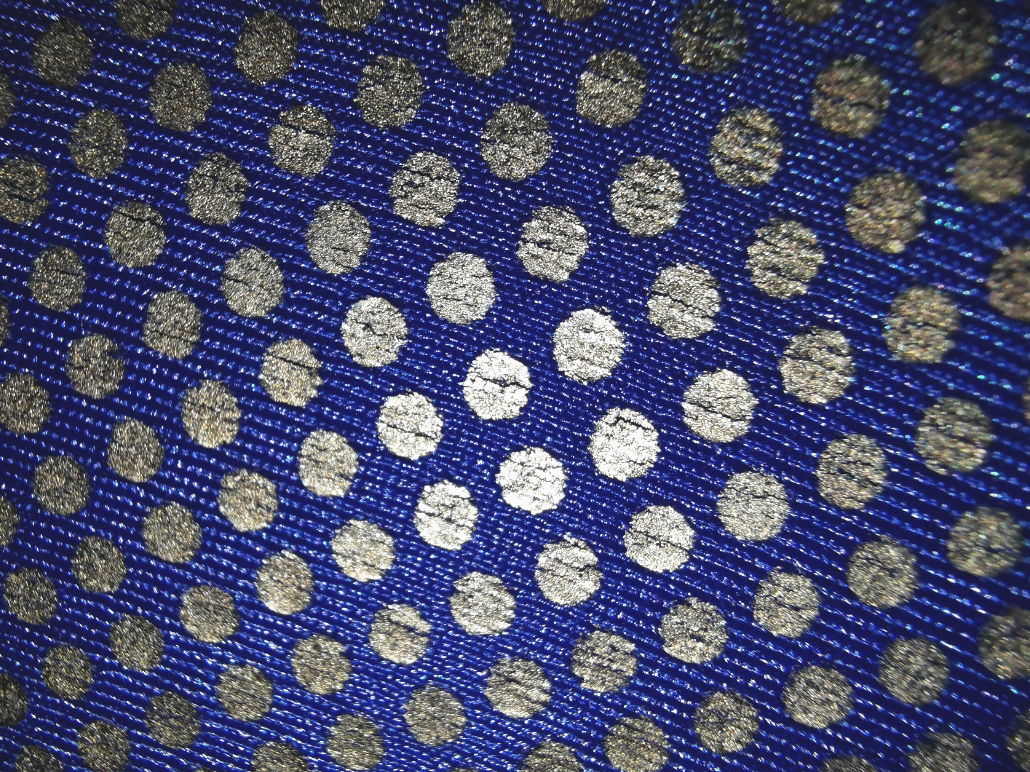 箔素材の拡大写真 「ツーウェイトリコット・カラーメタリック加工」は1997年のカタログで登場した素材。 水玉模様のような大き目のドットが特徴だ。 このため少し独特な光の反射を見せる。 |