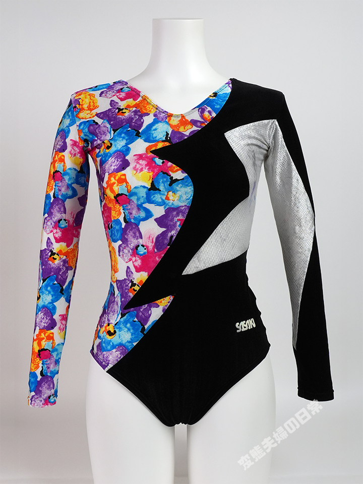 物凄く刺さるものがある。 それは私が中○生の時、同級生の新体操部員がこんなデザインのレオタードを着ていた事が発端になっている。 この時から出来るだけ近いものを探し続けて(実際は同じものが欲しいが)、一番イメージに似通っていたのがこのモデルだったのだ。 さて、この一着を購入して着てみた時に何かが足りない事に気付いた。 なんと特徴的な襟部分が切り取られているではないか! しかも箔部分は色移りしもしているし・・・ (という事で後に同じモデルをもう一着購入する事になる・・・) 切り取られてしまった襟部分に最初は物足りなさを感じたが、 慣れてしまうと「これはこれでアリかもしれない」と思うのだから不思議なものだ。 今では「ネック無し」というもう一つのバリエーションとして、何気に気に入っていたりする。 (自分で切ろうと思っても切れないので) |