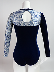 インディゴブルーのベロアが美しいこのレオタードは、ササキスポーツ2008年のカタログモデルである。 ササキスポーツはこのモデルを「一般用」、つまり用途を指定しないモデルとしてカタログに載せていたが、 既にこの頃の新体操はスカート付きが主流であり、実質このモデルは器械体操用と見て差し支えないと思う。 ところで2000年代の体操用レオタードと言えば、新体操と器械体操で形もデザインもはっきりと道が分かれた時代である。 前者にはスカートが付き、箔素材やラインストーンで煌びやかに仕上げたモデルが多かったのに対し、 後者は箔素材や装飾はアクセント程度に、ダーク系のベロアをメインとした落着きのあるモデルが多かった気がする。 このモデルも正にその流れを汲むデザインで、2000年代後半らしいデザインと言えるだろう。 そんなこのモデルの見どころは、肩口から左袖にかけて続く複雑で細かい柄のプリントだ。 一見レース素材に見えるこの部分は、実はレース調のプリントを施したプリント生地で、近くに寄ると実にリアルな描写がされているのに驚かされる。 その上にはドット状の箔素材が乗り、光沢に変化を与えている。 そして上品で滑らかな光沢のあるインディゴブルーのベロアとの相性も抜群で、絶妙な切替えも相まってシンプルでありながらエレガントな雰囲気が漂う。 さりげなく配置したラインストーンもとても効果的で、非常に魅力溢れる一着だ。 この個体は新品同様のタグ付きという非常に状態が良く、お気に入りの一着である。 難点と言えば、状態が良すぎて袖を通せないというところだろうか。 これを着こなせるモデルさんに袖を通して頂きたいと思う次第である。 |