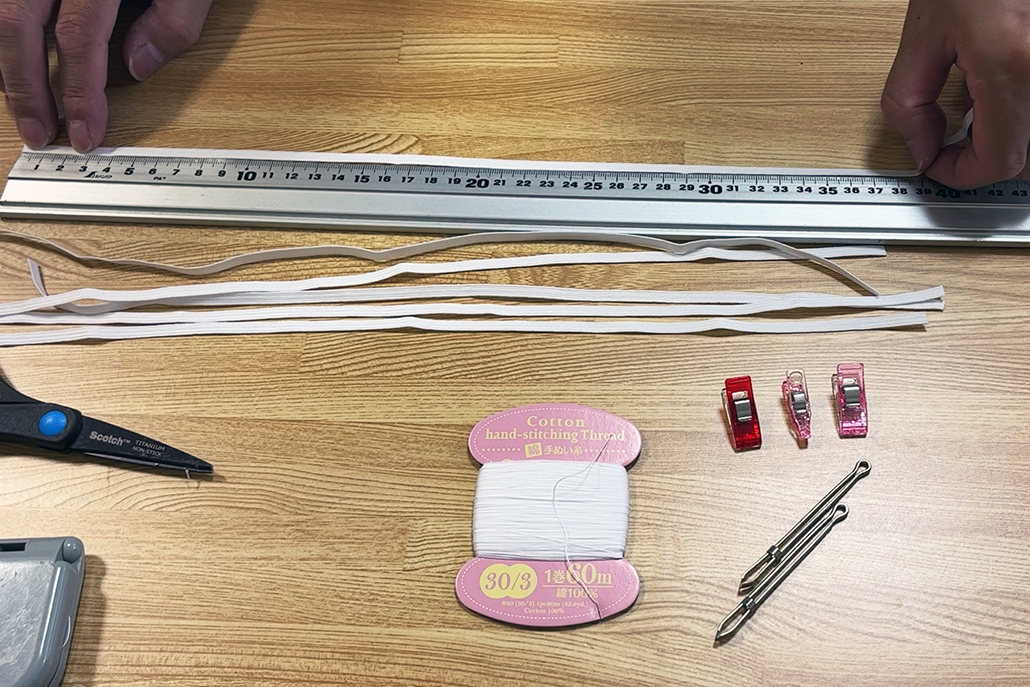 <用意するもの> ・縫い針 ・糸 ・交換用のゴム(ライクラタイプの6コール) ・ひも通し(挟むタイプが使いやすい) ・目打ち(あれば便利) ・ハサミ ・クリップ ・ボールペン ・定規 (ダイソーなど100均ショップで揃うかと思います) |