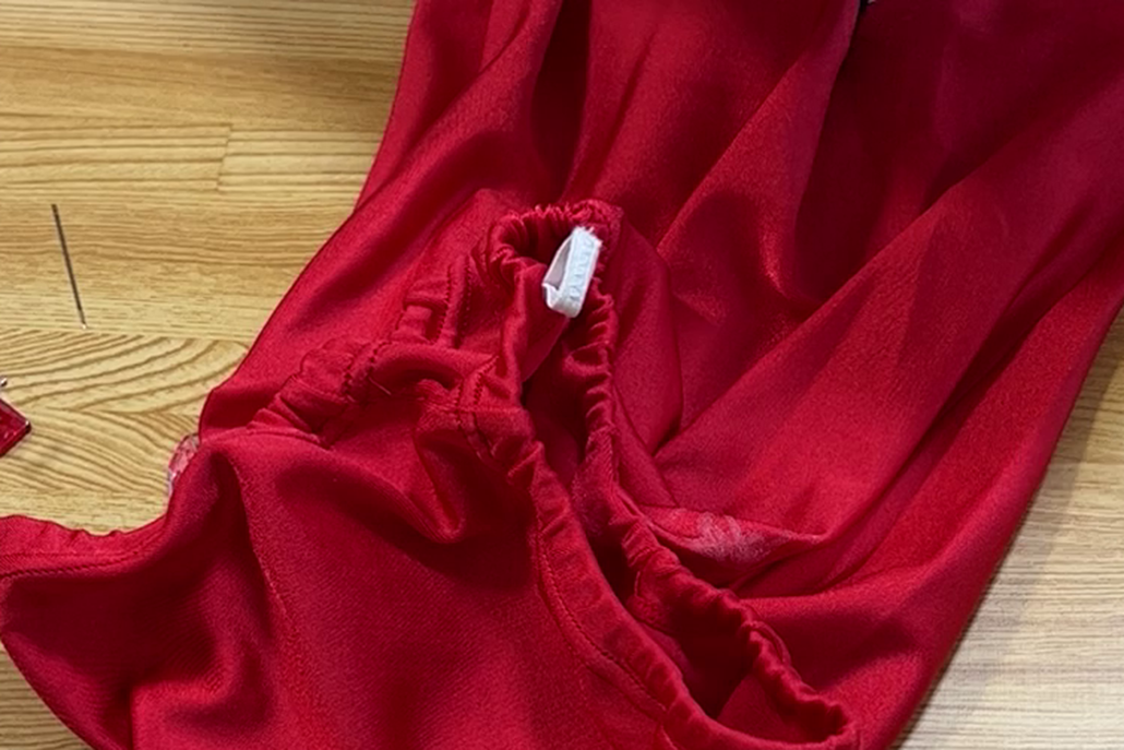 <作業手順> 1、レオタードから古いゴムを抜く 2、新しいゴムを準備する 3、新しいゴムを通す 4、ゴムの端を縫い合わせる |