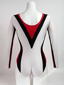 白色をベースに黒と赤の三色で構成されたシンプルなこのレオタードは、ミズノが手掛けたモデルである。 このレオタードは私の趣味で購入したものでは無く、オークションでまとめ買いした中に入っていたもので、偶然ウチに舞い込んできた一着だった。 ところが私はササキスポーツ#7222Gでも紹介した通り、 V字のデザインに対して「古臭くてダサい」イメージがあり、このモデルも入手当初はあまり好みで無かった。 希少なミズノ製のレオタードという事でコレクション入りとなったが、トルソーに着せてみると いかにも「ジャパン」という感じの配色と、絶妙な太さのラインが非常にマッチしている事に気付き、次第に「ダサカッコイイ感じ」にハマっていってしまった。 今では力強いV字のラインとサイドから腕へと伸びるラインがとても気に入っていて、コレクション入りして本当に良かったと感じている。 残念ながらこのモデルの登場時期は不明だが、デザインからして1980年代後半~1990年代初期のモデルではなかろうか。 生地は質の良いツーウェイトリコットで、このあたりはササキスポーツと変わらない印象だ。 無論、ミズノの縫製も非常に丁寧で、日本製の品質の高さを感じる。 強いて違いを挙げるなら、メーカーの違いによる僅かな着用感の差がある事くらいか。 |