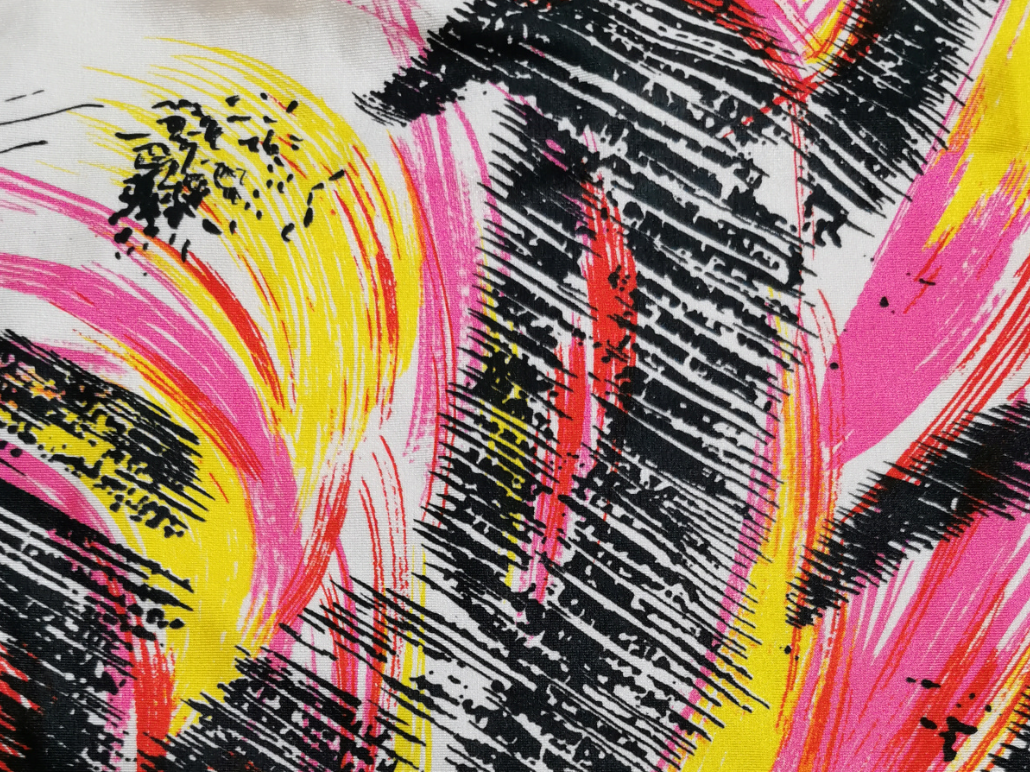 プリント柄の拡大写真 鮮やかな色使いが目を引くが、細かい線までしっかり描かれていて実に美しい。 まるで着る絵画のようだ。 赤や黄色からエネルギッシュな印象を受けるが、ピンクが入る事で女性らしが一気にアップする。 |