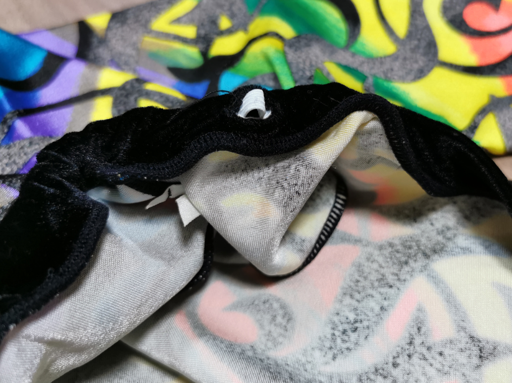 胸元のゴム ササキスポーツのレオタードは足口のゴムが入れ替えられるようになっているが、 肩口のゴムは生地と抱合せで縫いつけられている。 しかしこの個体は肩口のゴムが入れ替えられるようになっている。 非常に珍しい形状だ。 |