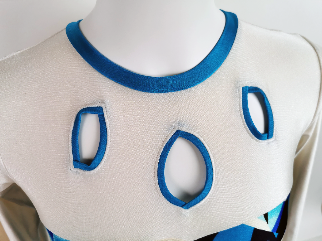 素材の拡大写真 本来はプリント、ベロア(黒色)、シースルー素材(白色)の構成だったところをカスタムでツーウェイトリコットのみに変更。 複合素材による見た目の面白さには欠けるが、レオタードらしい安定したデザインと言える。 |