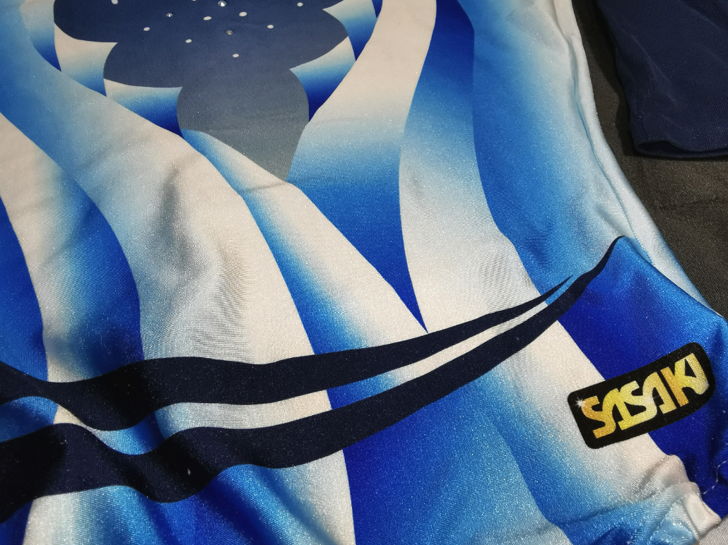 このSP-7160GLもその中の一つで、確か2016年か2017年あたりのモデルだったと記憶する。 レオタードの形状としてはU字ネックのオーソドックスなものだが、2010年代から流行しているメッシュ素材の袖を採用し、肌の色を活かした透け感がとても美しい。 そのメッシュの袖に流れるような柄が描かれたプリント生地との組合せがこれまた抜群で、加えて胸元のラインストーンが煌びやかな印象を添える。 カラーは画像のBU(ブルー)の他、P(ピンク)、G(グリーン)、N(ネイビー)、R(レッド)の5つで、そのうちG、N、Rの3色が受注生産であった。 当時、私はこのモデルを新品で購入したが、受注生産カラーのグリーンであったため、数か月待ってようやく手元に届いたものだ。 グリーンと言うとフレッシュなイメージがあるが、胸元と袖に配色された黒がデザインを引き締め、気品ある優雅な雰囲気に仕上がっているところがお気に入りだった。 残念ながらその一着は諸事情により手放してしまったが、その時の印象が忘れられず、機会があったらまた購入したいと思っていた。 あれから何年も経ってしまったが、ある日この個体を見つけて衝動買い。数年振りに思いを果たす事が出来た。 僅かにダメージがあったものの、コンディションはまずまず良好。今度は末永く大切にしていきたいと思う。 |
