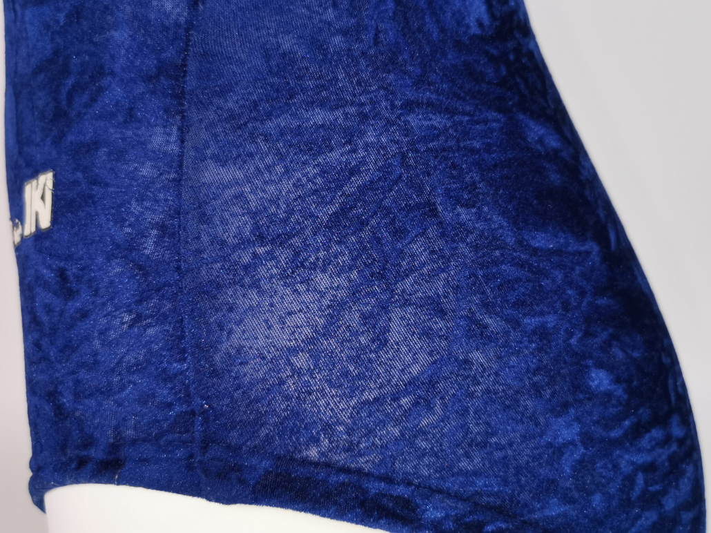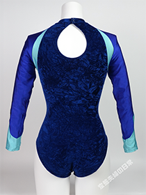 このレオタードはササキスポーツ2001年のカタログモデルで、品番末尾の“G”が示す通り、器械体操用のジムナスト型を採用したモデルとなる。 ジムナスト型はシンプルな切替えでボディラインをすっきりと見せ、静的な安定感と動的な変化や優雅さを見せながら左右のバランスをとったデザインをポリシーとしており、 このモデルもそれを踏襲したものと言える。 今見るとシンプルに映るデザインだが、当時は袖口の切替えのラインに新しさを感じたものだ。 胸元の装飾も同様に、今では大人しく見えても、これでも当時は煌びやかに感じた。 素材はボディー部にクラッシュベロア、袖にツーウェイトリコット、腕の付け根と袖口に箔素材を使用する。 カラーはご覧のインディゴブルーの他、アメジストの二色 を用意した。このコレクションは2025年にフリマサイトで入手したものであるが、手元に届いてみればどこもかしこも劣化が進み、状態としては「悪い」と言わざるを得ない。 それでもこの一着を入手したのは、かつて同じモデルの「アメジスト」を所有していたからで、懐かしさのあまり状態を気にせず購入してしまったのである。 本音とすれば当時と同じ「アメジスト」を手元に置いておきたいが、果たして入手出来る日は来るのであろうか。 ※関連レオタード:S-12【同デザイン、素材違い】 |