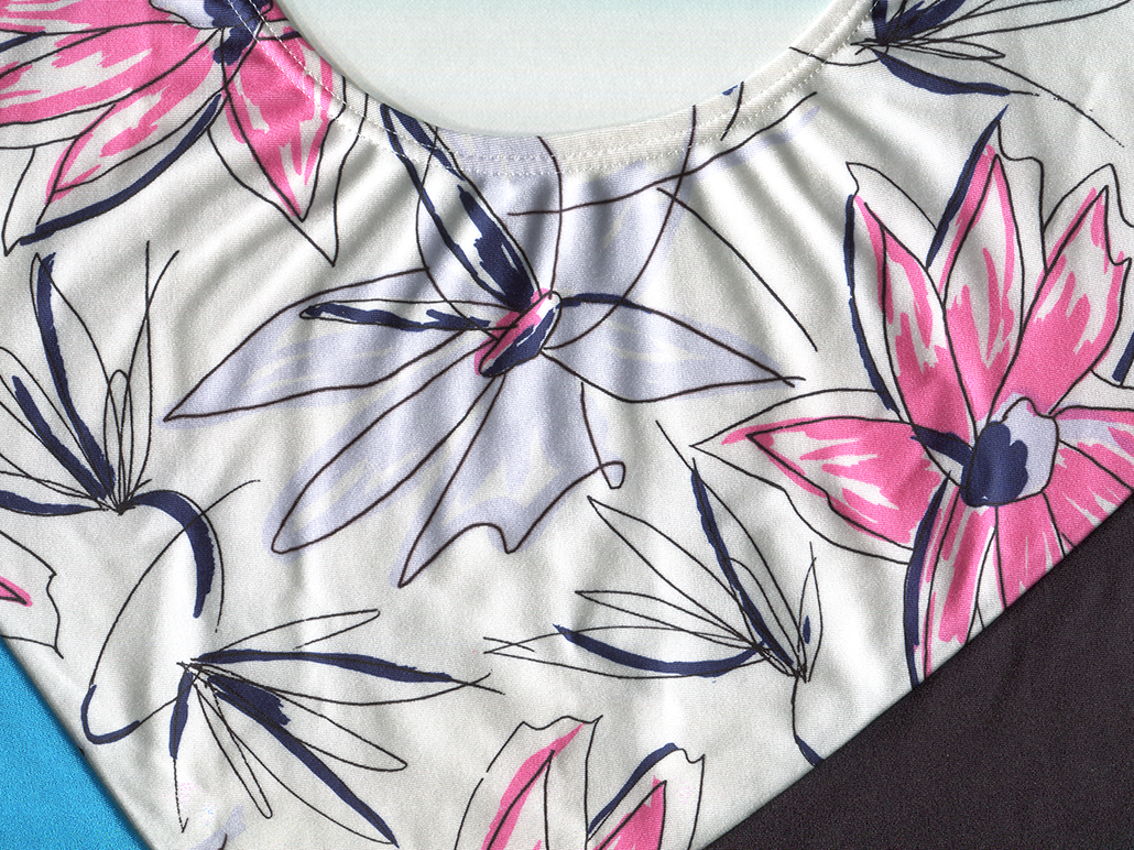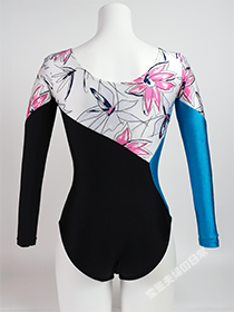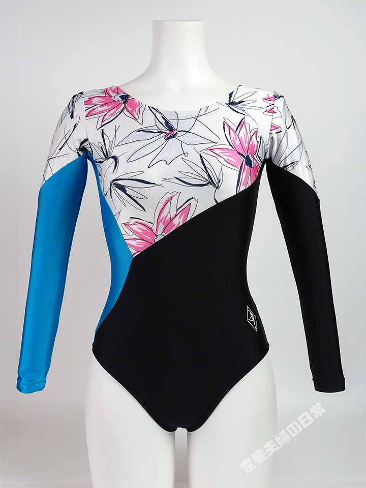 この花柄のプリントと二色のトリコット生地を組み合わせたレオタードは、ササキスポーツ1990年代初期のモデルにあたる。