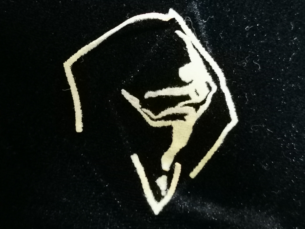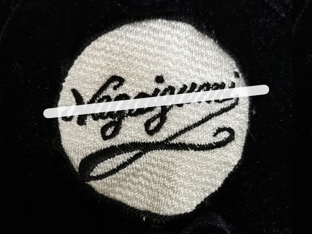 腰部分のアイコン ベロアのアイコンは、エンボス状のものを糊で貼り付けた形状をしている。 比較的丈夫だと思うが、経年劣化で糊が弱くなると剥がれ易い。 特に菱形の囲いは線が細いので、ここが剥がれ始めると一気にみすぼらしく見えてしまう。 |