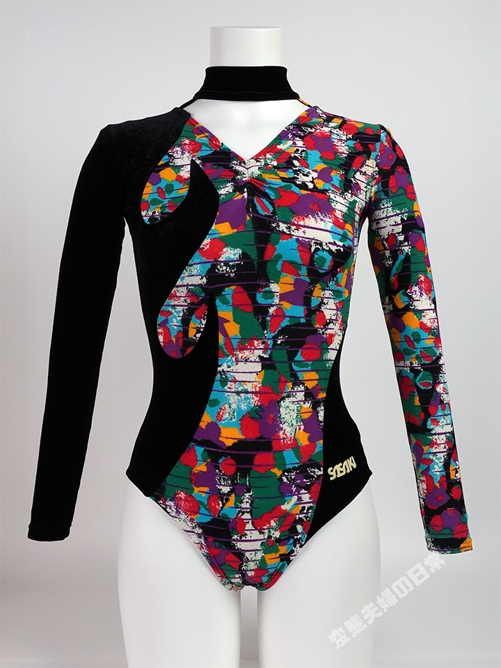 このレオタードはササキスポーツ1995年のカタログモデルで、その特色あるネック形状が物語っている通り、新体操向けにデザインされたレオタードである。 当時のカタログの中で「曲線的に連続する動きを、もっと美しく、もっと大胆に見せる新体操用のレオタード」という文言と共に、 「演技に変化をもたらすアシンメトリーなバランスを中心に、ポイントとなるネックバリエーションをさらに広げました」と紹介している通り、 左右非対称の大胆な切替えに、特色あるネック形状を採用したモデルとなっている。 このような一見不思議なラインをした切替えは、1990年代中期~2000年頃に多く見られたもので、しかもその多くがプリント生地とベロアの組合せであった。 そしてデザインのポイントだというネック形状は、1995年のカタログでは5つのモデルで採用されている。 つまり、このモデルは当時のトレンドの走りを盛り込んだ「欲張りな」モデルなのだ。 そんな時代のトレンドをふんだんに盛り込んだこのレオタードの特徴は、ズバリ「プリント生地」である。 デザインについてあれこれ紹介しておきながら生地に特徴があるとは意外かもしれないが、調べて見るとこれが中々面白い素材なのである。 まず、この素材(プリント生地)は「ツーウェイトリコット生地フルダル起毛加工・プリント」というもので、完全に光沢の無い「フルダル生地」である事に加え、 表面に起毛加工を施したというものだ。 カタログの解説によると「軟らかさと温かみを感じさせ、同じプリントデザインでもグンとソフトな印象に。コントラストの強い色使いでもフワッとしたイメージに仕上げます」 と紹介している。 レオタードの素材と言えば強光沢でツルツルの肌触りが持ち味だと思うが、敢えて「艶消し」を選択し、 しかも起毛加工という、従来の生地とは対極に位置すると言っても良い素材なのである。 それがフェチ的に響く素材かと言われれば違う気もしなくもないが、他のモデルには無い、特色ある素材である事は間違いない。 |