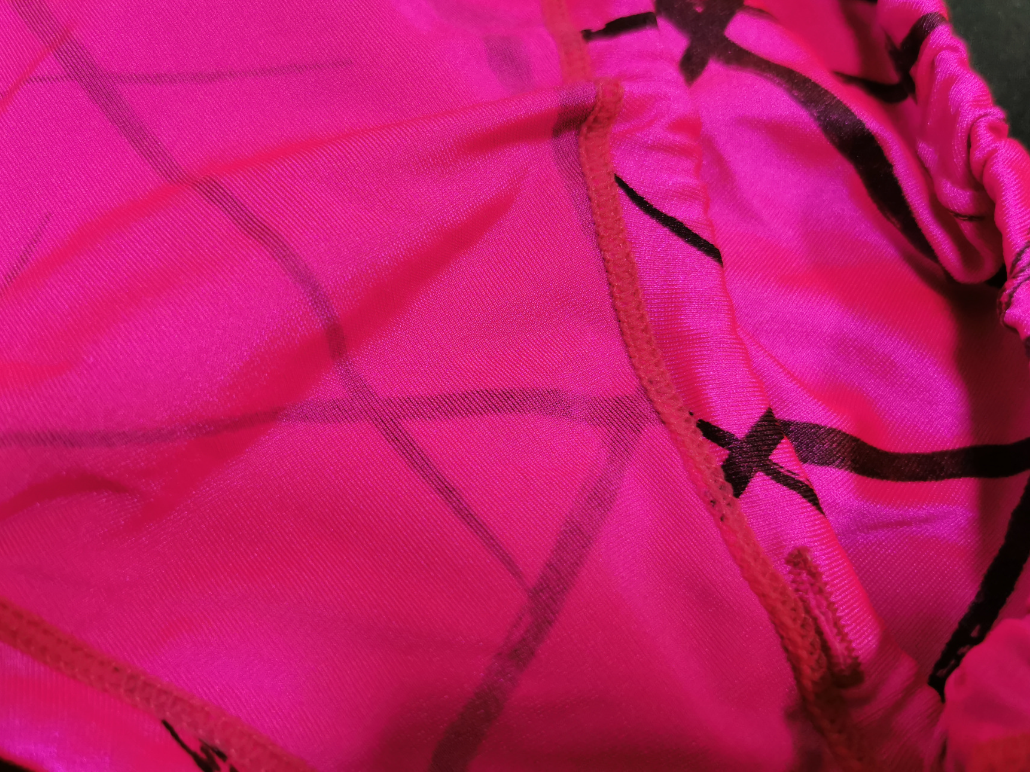 生地を裏側から見る プリント生地と言えば白い下地に色や柄を重ねるのが一般的だが、 このバンブーという生地は、色のあるトリコット生地に柄部分のみプリントしている。 |