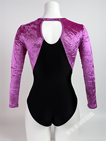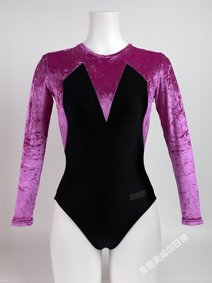 ベロアとトリコット生地を組合せたこのレオタードはササキスポーツ1995年のモデルで、器械体操用である「ジムナスト型」を採用したレオタードである。 このモデルの特徴は、独特な風合いを持つベロア生地にある。 1995年に登場したこのベロア生地は「メタリックベロア」と言い、 アセテート67%、ナイロン25%、ポリウレタン8%という生地組成を持つ。 アセテートはスポーツウェアでは聞かない素材だが、シルクのような光沢感や肌触りがあり、高級ファッション等に用いられる素材だそうだ。 一方デメリットとして摩擦と熱に弱く、デリケートな繊維でもある。 デメリットだけ見ると全く体操競技に向いていない素材だと思うが、それ以上に見た目の美しさを重視して採用されたのだろう。 しかしデリケートな特性が災いしたのだろうか、メタリックベロアは1997年のカタログを最後に姿を消したようだ。 非常に短命に終わった素材を採用しているため、希少なレオタードであるのは間違いないだろう。 |