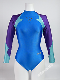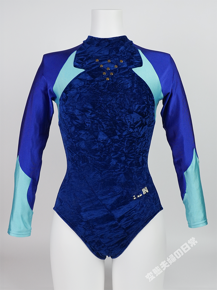 このレオタードはササキスポーツ2001年のカタログモデルで、品番末尾の“G”が示す通り、器械体操用のジムナスト型を採用したモデルとなる。 ジムナスト型はシンプルな切替えでボディラインをすっきりと見せ、静的な安定感と動的な変化や優雅さを見せながら左右のバランスをとったデザインをポリシーとしており、 このモデルもそれを踏襲したものと言える。 今見るとシンプルに映るデザインだが、当時は袖口の切替えのラインに新しさを感じたものだ。 胸元の装飾も同様に、今では大人しく見えても、これでも当時は煌びやかに感じた。 素材はボディー部にクラッシュベロア、袖にツーウェイトリコット、腕の付け根と袖口に箔素材を使用する。 カラーはご覧のインディゴブルーの他、アメジストの二色 を用意した。このコレクションは2025年にフリマサイトで入手したものであるが、手元に届いてみればどこもかしこも劣化が進み、状態としては「悪い」と言わざるを得ない。 それでもこの一着を入手したのは、かつて同じモデルの「アメジスト」を所有していたからで、懐かしさのあまり状態を気にせず購入してしまったのである。 本音とすれば当時と同じ「アメジスト」を手元に置いておきたいが、果たして入手出来る日は来るのであろうか。 ※関連レオタード:S-12【同デザイン、素材違い】 |