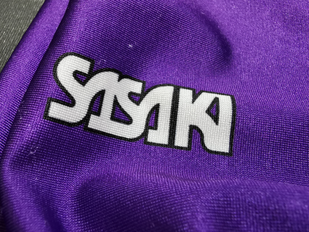 右腰に付くロゴの拡大写真 レオタードに限らず、メーカーロゴの劣化はコレクターを悩ます問題。 このモデルはプリント生地という利点を活かし、SASAKIのロゴまでプリントにしてしまった。 剥がれる心配がなく、これはアリだと思う。 |
