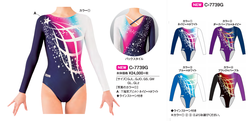 転写プリントによる「オールプリントモデル」である。 2010年代、新体操用レオタード(スカート付きモデル)はプリント生地を使ったモデルがラインナップされていたが、 器械体操用は箔素材やベロアを基調にモチーフやラインストーンで飾ったものが多く、プリント生地は使わない傾向があった。 そんな時に突如このモデルが登場して私は驚いた。 すぐさま購入しようとしたが、品薄の状態が続き、実際手に入れたのは数か月後の事だったと記憶する。 手元に届いて早速着用すると、まるで競泳水着のような「ギチギチ」と表現できる程タイトな着用感だったのを今でも覚えている。 全盛期のプリントモデルと比べて光沢が抑えられている気もするが、それでも発色も光沢も申し分ない。 そしてプリント生地の薄くてツルツルな感触は健在で、タイトな着心地もあって身体のあらゆる凹凸が浮き出てしまう。 可愛らしい色使いと絵柄とは裏腹に、相当エッチなレオタードだと断言して良い。 このモデルはパープルとネイビーの二色がラインナップされていたが、 次期2018-2019年のカタログでは絵柄はそのままに、 4種類のカラー展開へ変更