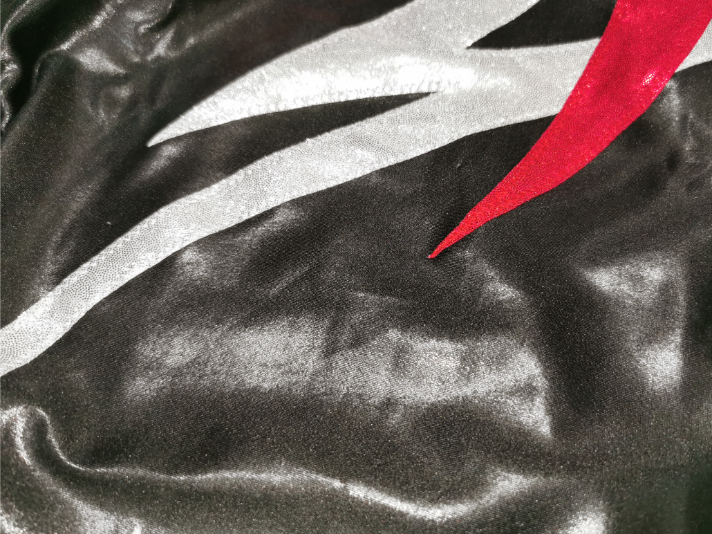 素材の拡大写真 黒い部分の素材は強光沢でヌメっとした質感を持つ。 これは非常に官能的な素材と言わざるを得ない。 モチーフの方は細かいドット状の箔加工素材で、輝きを重視している。 |