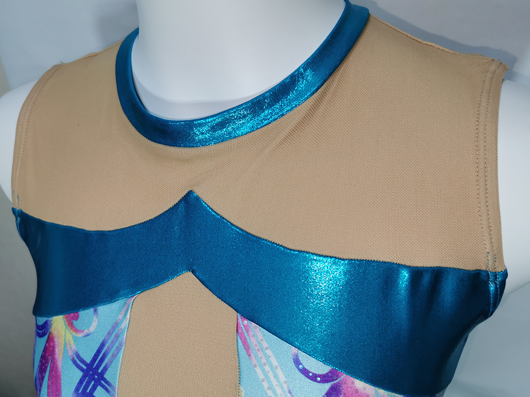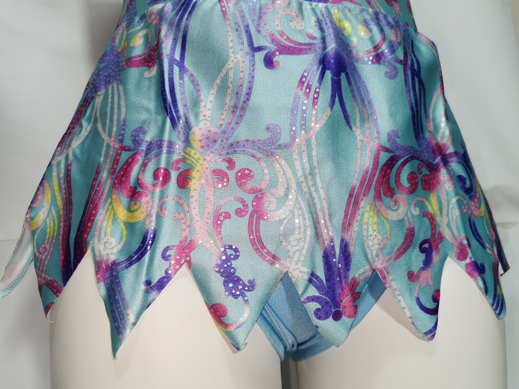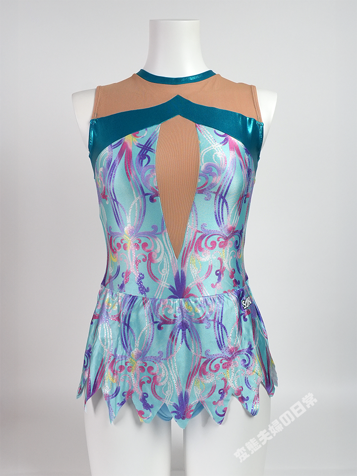 カラフルで可愛らしいグラフィックを全面に押し出したこのレオタードは、ササキスポーツ2014-2015年の新体操カタログモデルである。 この可愛らしい柄は植物の葉や花をモチーフとしたもので、その名もファンタジックフラワーという。 左右対称に描かれた模様の上には小さなドット状の箔素材が載り、ファンタジーの世界のような煌びやかで美しいプリント生地だ。 もちろんこのプリント生地も薄手で光沢があり、ツルツルとした触り心地が気持ち良い。 箔素材は襟と胸元にアクセントで入る程度に、その間をメッシュ素材で繋ぐデザインはこの頃の定番であるが、 この年のモデルはこのような構成(デザイン)ばかりで、デザイン的には面白みに欠けると思っていた。 ただ、選手たちはここから装飾でデコレーションし、思い思いの一着に仕上げていく。 ならば、そのベースとしてはもの足りないくらいで丁度良い・・・という事なのかもしれない。 ちなみにカラーは、このアクアブルーの他、ブラック、ライラック、ホワイトの四色が用意された。 ところで、新体操のレオタードにスカートが付いてから、新体操に対する熱が急降下したのは私だけではないはずだ。 腰に巻いた一枚の布にその魅力を奪れ、私のレオタードに対する熱は一度失ってしまった。 それから20年(!)の年月が経ち、ひょんな事からスカート付きのレオタードが私の手元に舞い込んできた。そこで私は新たな魅力に気付いてしまったのだ。 “スカート付きは所持するだけで背徳感が半端ない”という事に。 眺めているだけでそんな事を感じてしまうのだから、これを着たらどうなってしまうのだろう・・・ そんな思いが高まり、この一着を入手したのだった。 その初体験は興奮が強すぎて着用レビューは伏せておくが、想像以上の背徳感があったとだけ記しておこう。 |