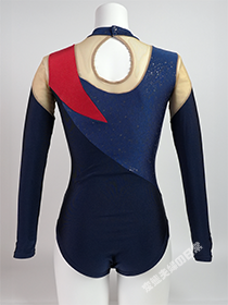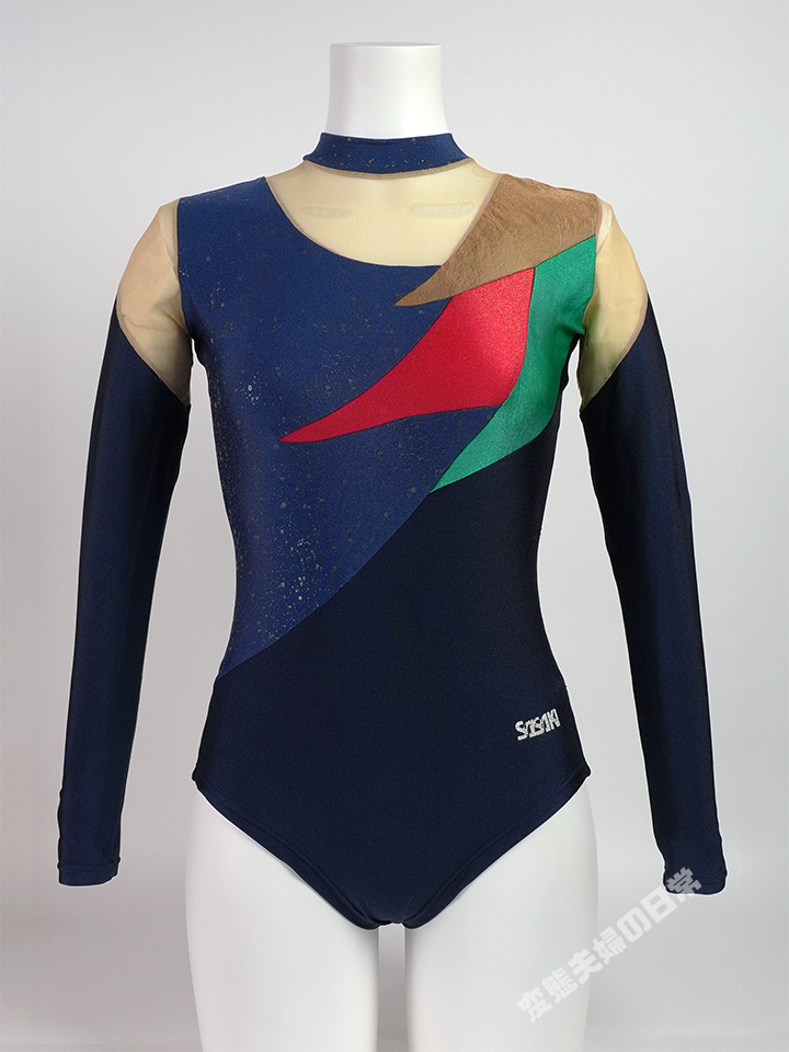 このレオタードはササキスポーツ2001年のモデルで、なんと一着に五種類もの素材を盛り込んだモデルある。 贅沢というか、意欲的というか、当時のレオタードはここまでしてキラキラ、ゴージャスに仕立てたかったのである。 そんな流れに違和感を持った私は、急速にレオタード熱が冷めてしまった時期でもある。 しかし今思えば、この直後に続くスカート付きのものよりずっとレオタードの形状をしており、 もう少し情熱があったら・・・と今更ながら後悔している。 だからこそこのモデルを入手したのであって、このサイトを立ち上げる切っ掛けにもなったのだ。 さて、改めてこのモデルを見てみると、なかなか面白いスタイルをしている事に気付く。 例えばメッシュ素材を上手く配置し、流れを断ち切ったデザインをしている点だ。 画像では分かりにくいと思うが、ノースリーブのレオタードに、 セパレートのアームカバーのような袖が付いているように見えなくもない。 また、襟の部分も浮いているように見せており、この手法はこの年の他のモデルにも採用している。 箔素材を上の方に集中させ、ネイビーのトリコット生地を下の方に配置する事で、 シックでありながら、さりげなくゴージャスな雰囲気も合わせ持つ、上手いデザインだと思う。 だが選手たちは、ここから更にスパンコールやラインストーンでデコレーションしていくのだ。 この手元の一着は箔素材の劣化や、一部メッシュ素材の損傷もあり、良いコンディションとは言い難い。 それでも、こういう時代もあった事を証言する貴重な一着として、大切にしていきたい。 |