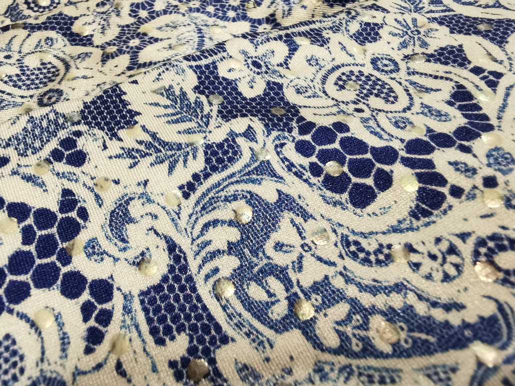 プリント生地のマクロ撮影写真 レース風の柄をプリントした生地。 マクロで見るとレース柄の再現度が高く、本物のレースに見える。 その上にドット状の箔加工を施すことで光沢に変化を与えている。 |