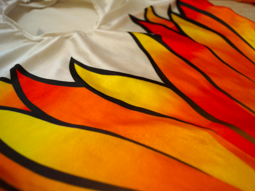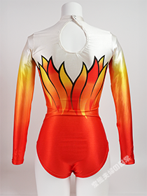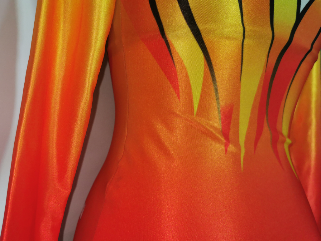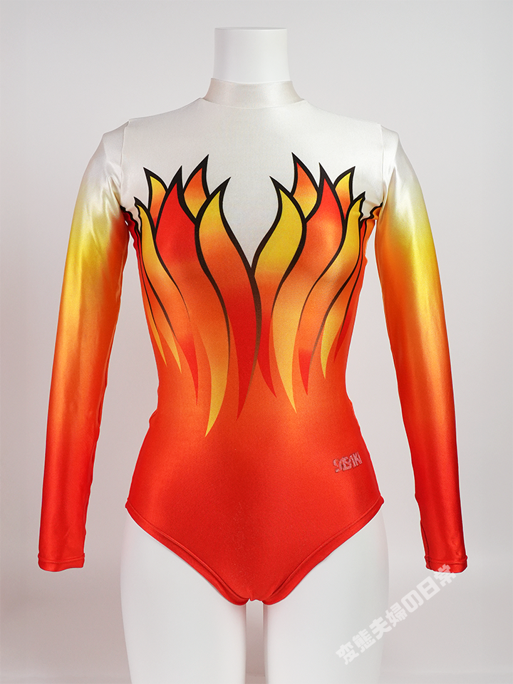 加えて、ササキスポーツが久々にリリースしたオールプリントモデルである。 この間、素材はベロアが主流になったり、箔素材が流行したり、装飾が付いたり、最終的にはスカートまで付いたりと、 旧来のレオタードファンにとってショッキングな出来事が続いていた。 そこにきて、このモデルの登場である。私は狂喜乱舞し、迷わず購入した。 お恥ずかしながら、当時このモデルを入手するまでオールプリントモデルは所有したことが無く、これが初めての一着となった。 (当時のオークションでも高値で取引されていて、手が出せなかった) 初めて着用した時の事は今でも憶えている。 通常のトリコット生地とは明らかに異なる肌触り、光沢感、そして着心地にとても興奮した。 特にこのオレンジ色の発色と光沢は他には無い、完全にこのモデルだけの“one&only”である。 カラーバリエーションはこのオレンジの他にピンクとブルーがあり、本当は全て揃えたかったが、それは叶わなかった。 なぜならこのモデル、定価が25,200円もしたのだ! |