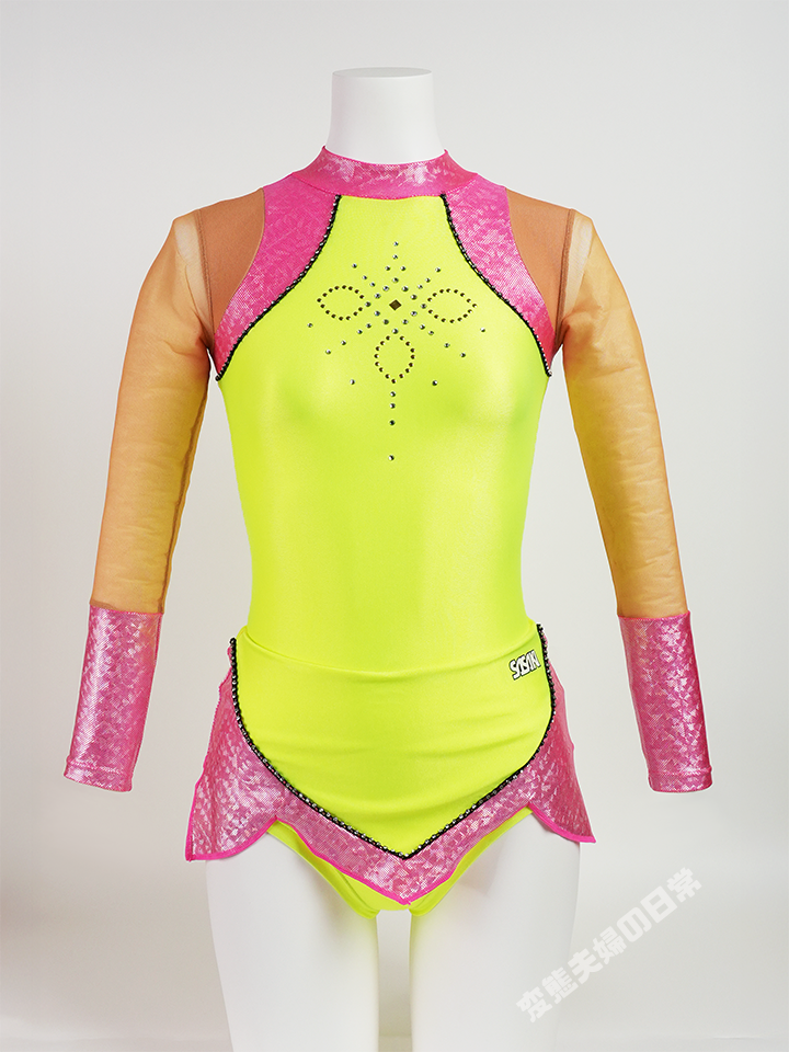衝撃的な出来事であったし、あの「形状」には正直落胆しかなかった。 あれから20年以上が経過し、すっかり定番の形となったスカート付きレオタードだが、 未だにアレルギー的に拒んでしまう旧来ファンも居るのではないだろうか。 少なくとも私はそうだった。 そんな私がひょんな事からスカート付きを入手し、初めて気付いてしまった。この類のレオタードが持つ“半端ない背徳感”に。 こうしてスカート付きの魅力が少し分かったような気がして、某フリマサイトで購入したのがこの一着だ。 このレオタードはササキスポーツ2010年のカタログモデルで、ササキスポーツのイージーオーダーシステムであるオーダーコンポモデルである。 箔素材に、ラインストーンに、ダイヤブレードと呼ばれる装飾も付いていて相当コテコテになりそうな内容だが、 こんなに可愛らしくまとめあげたササキスポーツに今更ながら感心してしまった。 ちなみにこのサイズはJL(ジュニアL)であり、完全に観賞用として購入した。ジュニアサイズは取引価格が安めなのも嬉しい。 ところで価格と言えば、新体操用のレオタードは非常に高価なものが多く、このモデルもまともに購入したら定価が47,760円もするのだ。 これはラインストーンとダイヤブレードという装飾付きの価格であるが、これらを無しにしても19,950円もする。 新体操も中々お金が掛かる競技なのだと実感する。 この品番はJL~L2までサイズを揃えており、成人用のものが入手できるのなら一度着てみたいモデルである。 |