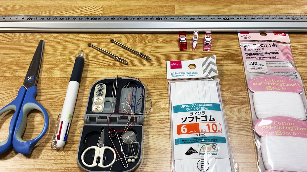 <用意するもの> ・縫い針 ・糸 ・交換用のゴム(ライクラタイプの6コール) ・ひも通し(挟むタイプが使いやすい) ・目打ち(あれば便利) ・ハサミ ・クリップ ・ボールペン ・定規 (ダイソーなど100均ショップで揃うかと思います) |