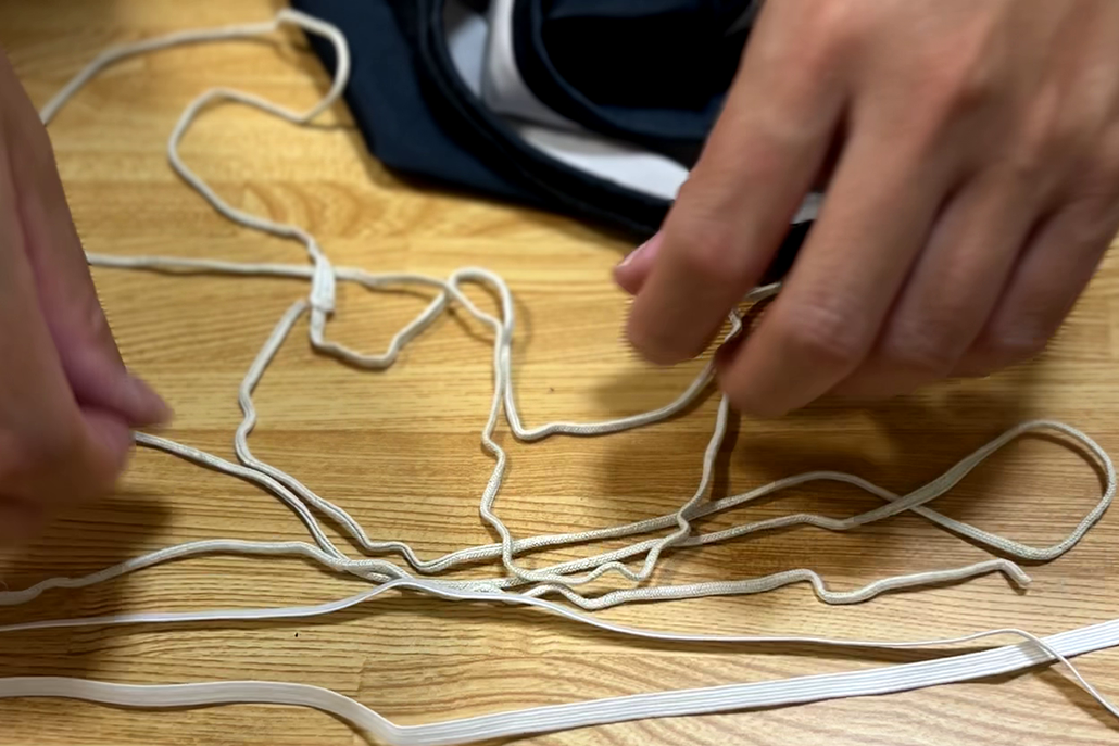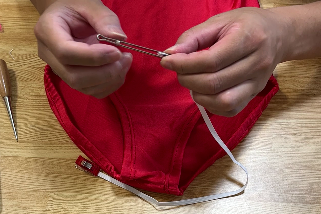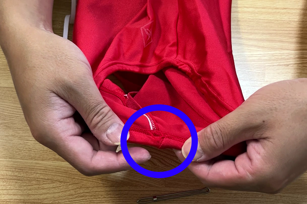 <作業手順> 1、レオタードから古いゴムを抜く 2、新しいゴムを準備する 3、新しいゴムを通す 4、ゴムの端を縫い合わせる |