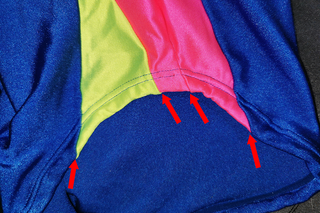 始める前に、ゴム交換が出来るタイプのレオタードを確認しておきます。 交換が出来るレオタードは、fig.1-aのような形状のタイプ。 脚ぐりが袋状になっており、内側にゴムを入れる穴(fig.1-b)があります。 交換が出来ないレオタードは、fig.2のような形状のタイプ。 脚ぐりに直接ゴムを縫い付けているタイプは、基本的に交換出来ません。 海外製レオタードはほとんどこの形状です。 現行のササキ・ジムナスト型もこの形状なので、交換不可です。 |
