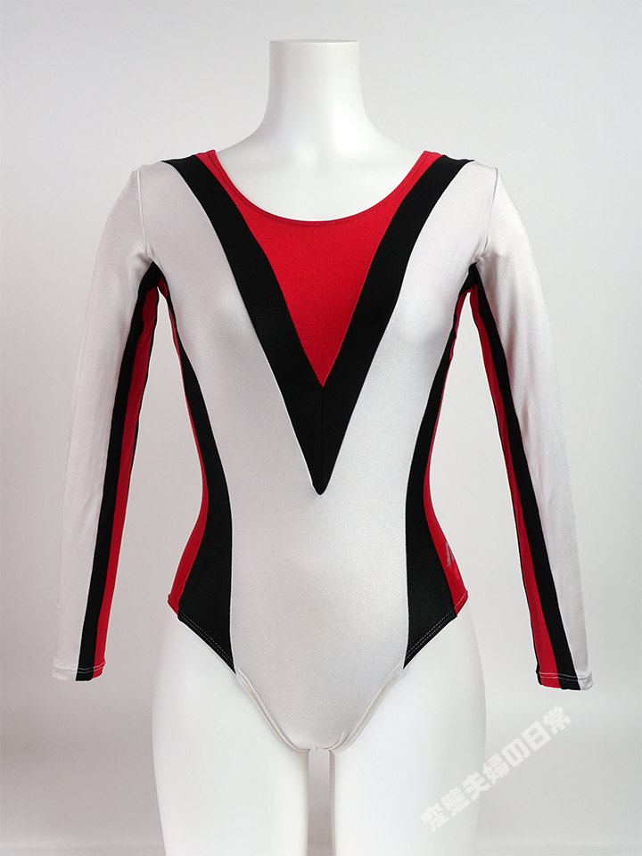 白色をベースに黒と赤の三色で構成されたシンプルなこのレオタードは、ミズノが手掛けたモデルである。 このレオタードは私の趣味で購入したものでは無く、オークションでまとめ買いした中に入っていたもので、偶然ウチに舞い込んできた一着だった。 ところが私はササキスポーツ#7222Gでも紹介した通り、 V字のデザインに対して「古臭くてダサい」イメージがあり、このモデルも入手当初はあまり好みで無かった。 希少なミズノ製のレオタードという事でコレクション入りとなったが、トルソーに着せてみると いかにも「ジャパン」という感じの配色と、絶妙な太さのラインが非常にマッチしている事に気付き、次第に「ダサカッコイイ感じ」にハマっていってしまった。 今では力強いV字のラインとサイドから腕へと伸びるラインがとても気に入っていて、コレクション入りして本当に良かったと感じている。 残念ながらこのモデルの登場時期は不明だが、デザインからして1980年代後半~1990年代初期のモデルではなかろうか。 生地は質の良いツーウェイトリコットで、このあたりはササキスポーツと変わらない印象だ。 無論、ミズノの縫製も非常に丁寧で、日本製の品質の高さを感じる。 強いて違いを挙げるなら、メーカーの違いによる僅かな着用感の差がある事くらいか。 |