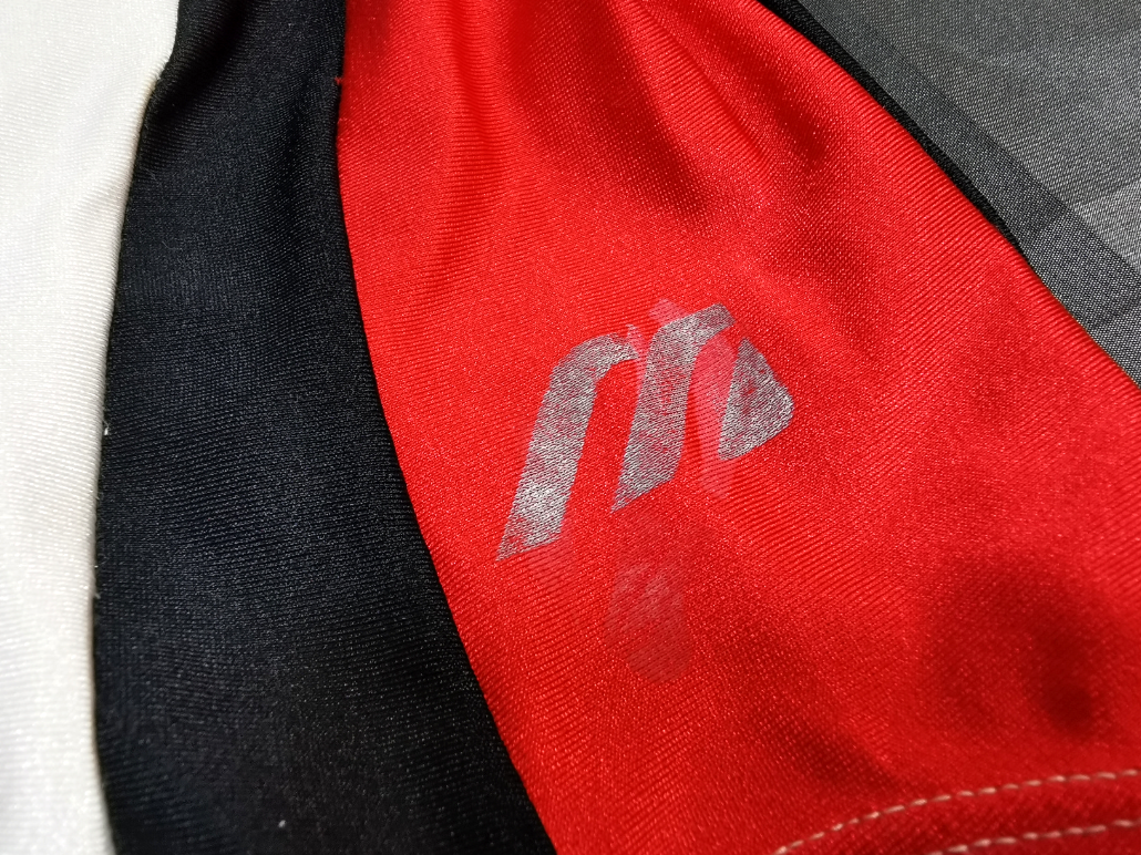 左腰に付くミズノ「M」マーク 左腰にはお馴染みの「M」マークが付くが、ロゴ自体は剥がれてしまい、糊の跡がMマークの痕跡を残す。 多くのミズノ製品がそうであったように、このモデルも白いMマークを付けていたのだろう。 |