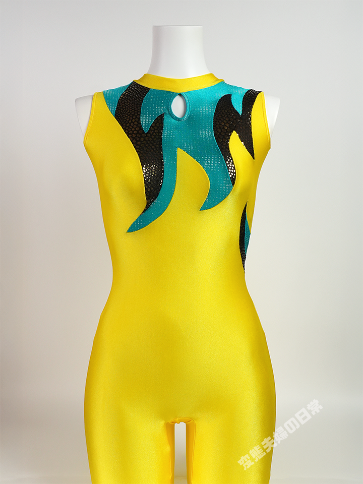 ユニタードを着用する選手を多く見掛けた。 私もカタログを通して多くのユニタードモデルを見てきたが、意外にもコレクションするのはこれが初である。 その理由としては、他に欲しいモデルが沢山ありすぎて、いつも後回しになっていた為であるが、 言い換えると、長袖レオタード好きとしては、ノースリーブモデルが多いユニタードの優先順位は低かったという事だ。 そんなこんなで、ユニタードの導入を見送っていたのだ。 そんな私がこのミズノのユニタードを購入したのは、このサイトを制作していた2022年頃の事だったと思う。 色々な種類のレオタードを手元に置いておきたいと思っていた時に、オークションで入手したと記憶する。 残念ながらこのモデルの詳細は不明だが、胸元の箔素材から1990年代末期のモデルではないだろうか。 このモデルの背面に注目するとファスナーバックスタイルとなっていて、この頃と思わしき新体操の様子を見ると ファスナーバックのユニタードを着た選手が結構いて、これが流行のスタイルだったという事が分かる。 新体操でファスナーバックはポピュラーなスタイルであり、着用感も良く、好む選手も多かった証とも言えるのではないだろうか。 そんな一時期を築いたユニタードだが、2000年代になるとスカート付きレオタードに取って代わり、全く見られなくなってしまった。 ところが近年になって女性アスリートが性的な目的で撮影される問題を背景に、再び注目を集めているらしい。 実際に2024年開催のパリ五輪の新体操で、ドイツ代表の選手がユニタードを着用している。 「流行は繰り返す」とは言うが、果たしてユニタードが復権を果たす日は来るのであろうか。 |