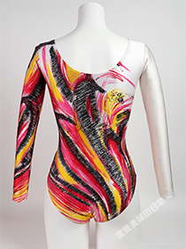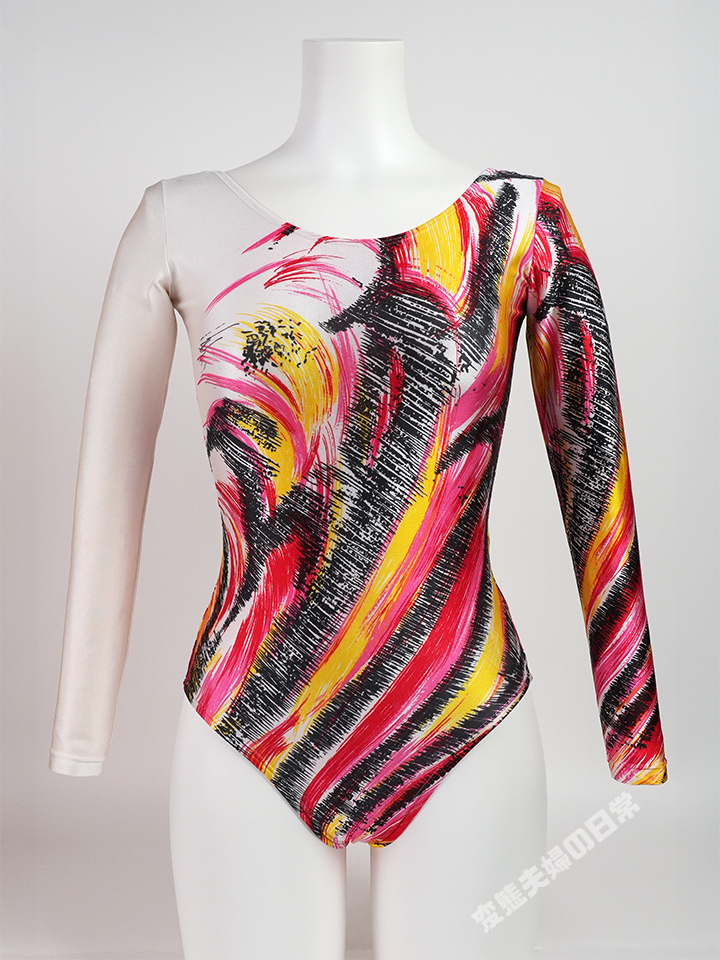 まるで絵画のような絵柄のこのレオタードは、オークションでまとめ買いした中に入っていた一着である。 残念ながらモデルの詳細は不明だが、1980年代末期~1990年代初期のモデルではなかろうか。 色鮮やかな柄はプリントによって再現されており、色鉛筆で描いたような細かい線までしっかり描かれている。 鮮やかな色使いと風になびく花のような柄は実に女性的で、リボンの演技にとてもマッチしそうなデザインだ。 もちろんこの時代のプリントモデルに共通する、スベスベとした伸びの良い生地と上品な光沢はこのモデルでも健在で、 まさに良き時代の醍醐味が詰まったモデルと言える。 |