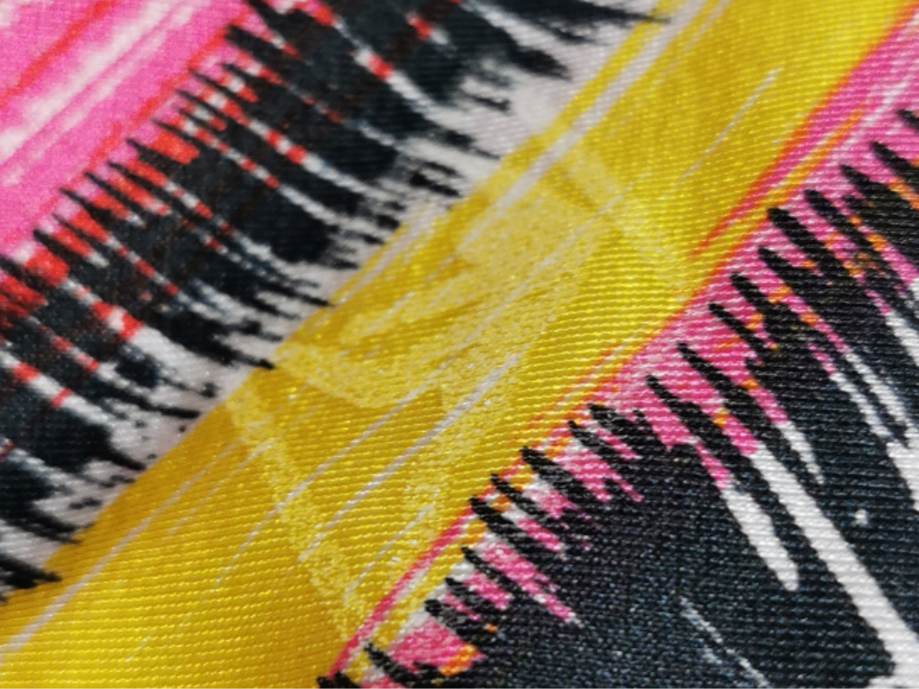 プリント柄の拡大写真 鮮やかな色使いが目を引くが、細かい線までしっかり描かれていて実に美しい。 まるで着る絵画のようだ。 赤や黄色からエネルギッシュな印象を受けるが、ピンクが入る事で女性らしが一気にアップする。 |