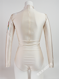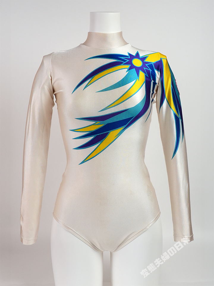 同じデザインでカラー違いのオールプリント、ハイネックモデルを紹介する。このレオタードも詳細は残念ながら不明であるが、1990年あたりに販売されたモデルではないだろうか。 他のオールプリントモデルがそうであるように、このモデルも伸縮性が高く、薄くてツルツルとした強い光沢を持つ生地が特徴だ。 加えてアンダーまで透ける白色や、包み込まれるようなフィット感のあるファスナーバックのハイネックのスタイルなど、 極めてフェチ度が高いモデルである。 またデザインに関しても、左肩から風になびくリボンのイラストが描かれただけというシンプルなもので、背面に至っては無地という潔いもの。 派手さや奇抜さは無いが、このシンプルさもこのモデルの魅力だ。 さて、この白いモデルは過去に所有したことがあったが諸事情により手放してしまい、これが二着目のコレクションとなる。 コンディション的には生地に伸びた感じや引っ掛けたような痕があり、状態としては中の下といったところであるが、 腕には校章と思われるワッペンがついており、現役当時の雰囲気を残す一着だ。 長いこと探して再入手した一着なので、もう一着のブラックと共に大切に保存したい。 ※関連レオタード: S-06【同じチームワッペンのレオタード】 |