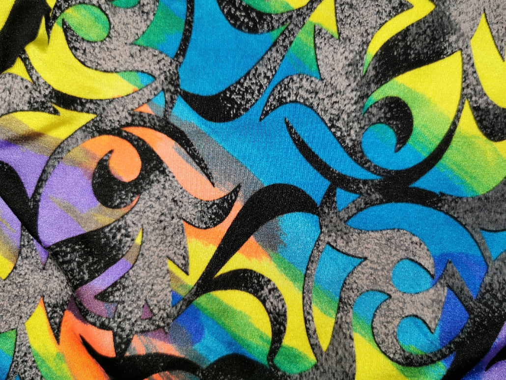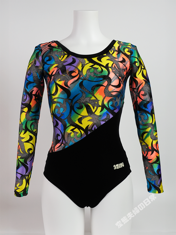 特段思い入れが無いにも関わらず買ってしまったというもの。 それでもこのレオタードを入手したのには訳があって、それはこのプリント生地にある。 「アラベスク」と名付けられたこのプリント生地は1996年に登場し、成人、子供用問わず多くのモデルで採用された。 ツーウェイトリコット・ブライトプリントというその名の通り、美しい光沢のあるプリント生地だ。 この頃のササキスポーツはプリント生地に非常に力を入れており、毎年のように新しい絵柄を登場させた。 そのモデルライフは数年に渡るものが多いが、それでも移り変わりは早く、 この時代を象徴するプリント生地はコレクションとして外せないと考えたのだ。 さて、手元にあるこのレオタードをカタログで探してみても全くヒットせず。 もしかしたらオーダー品なのかもしれない。 何の変哲もないありがちなモデルだと思い込んで買ったこのレオタードは、実はオンリーワンな一着なのかもしれないのだ。 |