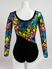 プリント生地とベロアの組合せという、割と90年代にありがちなモデルに見えるこのレオタードは、