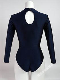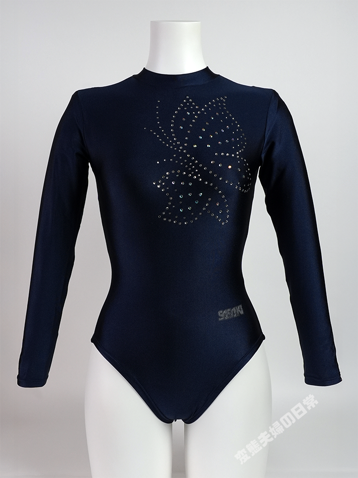 ただ、2000年代中期~後期にかけてモチーフが付いたレオタードを良く見かけたので、その頃のモデルではないだろうか。 このモデルはジムナスト型といって、器械体操競技者向けのパターンを採用している。 具体的には、上半身から腕にかけて筋肉が発達するため袖口や上半身は幅を広めにとり、 ウエストからヒップは余分を削ってタイトにフィット。 足口はシャープなラインと運動量確保のためレッグアップさせ、シャープなシルエットとなっている。 ところで、このレオタードは単色のトリコット生地にラインストーンのみという、極めてシンプルな構成をしている。 当館のコレクションの中でもダントツでシンプルなものだ。 だからと言って物足りなさを感じる訳でも無く、 むしろ夜空に輝く星座のような美しいデザインだ。 ジムナスト型という機能美と、ラインストーンの輝きが見事に融合した一着と言えるのではないだろうか。 |