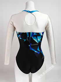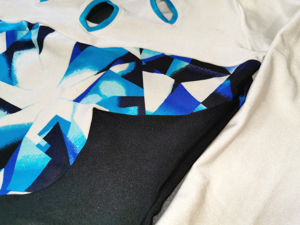 素材の拡大写真 本来はプリント、ベロア(黒色)、シースルー素材(白色)の構成だったところをカスタムでツーウェイトリコットのみに変更。 複合素材による見た目の面白さには欠けるが、レオタードらしい安定したデザインと言える。 |