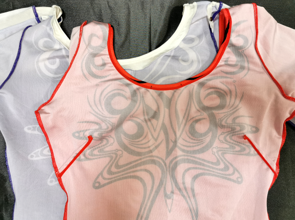 同じ絵柄を持つオールプリントモデルである。この二つのモデルを見比べて、カラー以外に違う点がある事に気付いただろうか。 #7159は襟ぐりと袖に白のラインが入っているのに対し、こちらはそのラインが省略されているのだ。 もしかしたら省略した方も品番のあるカタログモデルだったかもしれないが、確認できる資料が無かったため、 詳細不明のモデルとした。もし詳細をお知りの方がいたら、是非情報を寄せて頂きたい。 ところで上記の「襟ぐりと袖のライン」について、#7159では別のトリコット生地をあてがっている為、 厳密に言うと#7159はオールプリントモデルではない。 これに対し、それらが省略されたこちらは完全なオールプリントモデルで、 例えば袖の触り心地で言えばこちらに軍配が上がる。これはこれで「アリ」ではないか。 ただ、コンディションとしては中の下といったところで、何ヶ所か生地を引っ掛けたようなダメージがあり、 極小の穴が開いてしまっているところもある。 面白い一着だけに、そこだけが少々残念だ。 ※関連レオタード: #7159 ①、 #7159 ②、【同じプリント柄のレオタード】 |