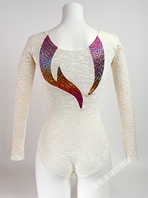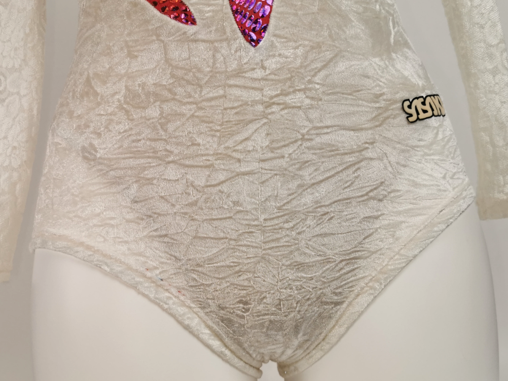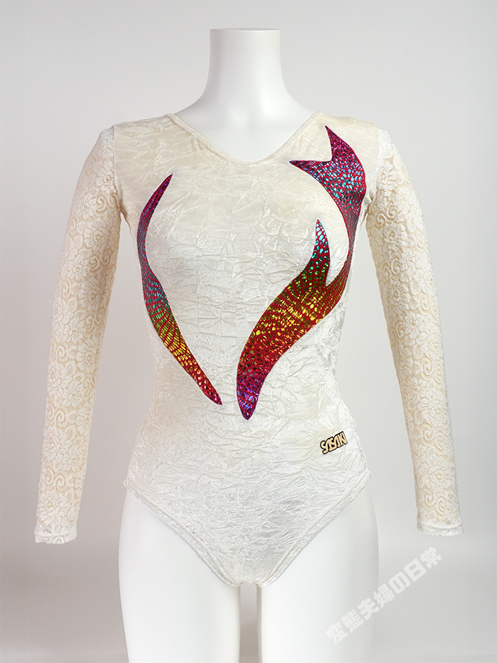 襟ぐりの形状をボートネックからV字に変更したカスタムモデルと思われる。 そのベースとなった#7417の特徴と言えば、ネックラインから飛び出したホログラムのモチーフ であった。これを大胆で個性的と言えば聞こえはよいが、どう見ても変わったデザインである。 一方こちらのモデルは、襟ぐりをV字にする事でモチーフを配置する面積を僅かながら拡大し、 加えてモチーフも襟のラインに収まるように配置も変更。 ベースの#7417と比べると随分大人しく見えるが、個人的にはこちらの方が好感が持てる。 袖は可憐な花柄が描かれたエレガントな雰囲気のレース素材で、当方のコレクション #7170 と同じものだ。ちなみに袖のレース素材と先に紹介したホログラムのモチーフの箔(ツーウェイトリコット・ホログラムグラデーション加工)はどちらも 1998年に登場した素材で、当時の新素材を惜しみなく投入したモデルである。 それにしても、白いレオタードというのは、何か特別なものを感じる瞬間があって大好きなカラーだ。 白いレオタードは幾つか所有しているが、実は白のクラッシュベロアはこれが初のコレクションで、 このモデルを購入した大きな理由でもある。 手元でじっくり眺めてみると、ランダムに入った無数のシワが様々な表情を見せ、 実に美しい素材である事に改めて気付かされた。 そして当時は派手に見えてあまり好みでなかったホログラムのモチーフだが、現代の目線だと非常に効果的なワンポイントで、白のクラッシュベロアとの相性も抜群だ。 シンプルでありながら素材をバランスの良く組合せており、高級感すら感じる。 こうして振り返ると、1990年代末期のデザインも非常に素晴らしいと思う。 |