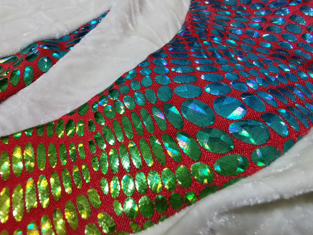 ホログラムのモチーフの拡大写真 大きなモチーフはツーウェイトリコット・ホログラムグラデーション加工という箔素材で、S-20でも見られたもの。 寄ってみるとストロングレッドの生地の上にレインボーカラーの箔を乗せており、まるで熱帯魚のような輝きを見せる。 カラーは下地の違いでストロングレッドとホワイトの二色を用意した。 |