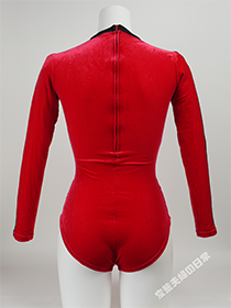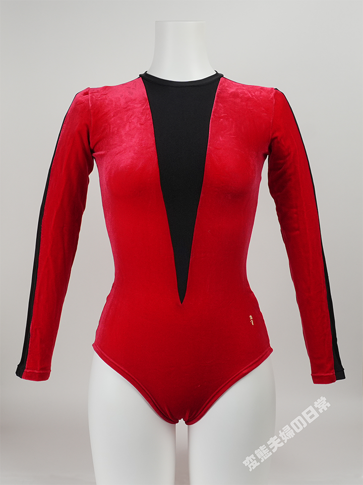 今回紹介するレオタードは残念ながら詳細不明であるが、1990年前後のモデルではないだろうか。 その推測は最後に紹介するとして、赤いベロアと黒いツーウェイトリコットのアクセントのみという、極めてシンプルなデザインに惹かれて購入した。 この「黒いアクセント」というのが効果的で、特に首元から袖の外側に伸びるラインがとても良い。 似たようなラインを持つモデルに #7159 、